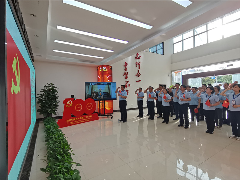 公司黨委書記王吉才領誓,機械院全體黨員重溫入黨誓詞,老黨員吳家修通過視頻連線同步重溫入黨誓詞。
