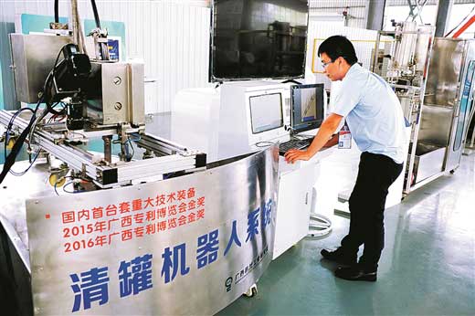 打造首臺套高壓清洗機器人。2014年底,高壓清洗機器人系統(tǒng)在廣西上上糖業(yè)有限公司正式投入榨季運行,標志著高壓清洗機器人系統(tǒng)研發(fā)成果順利實現(xiàn)產(chǎn)業(yè)化推廣。該系統(tǒng)是完全自主研發(fā),共獲21項專利(其中發(fā)明專利5項),獲廣西專利博覽會金獎專利2項,并于2015年獲得自治區(qū)工信委國內(nèi)首臺(套)重大技術裝備認定,2018年獲得廣西創(chuàng)新發(fā)展驅(qū)動(重大)專項支持。高壓清洗機器人系統(tǒng)是面向國內(nèi)外制糖、輕工、食品、化工、制藥等行業(yè),在狹小受限空間、高溫潮濕環(huán)境下,代替人工清洗加熱管機構(gòu)的機器人,屬世界首創(chuàng),達到代替?zhèn)鹘y(tǒng)人工作業(yè)方式、減少人員傷亡、提高安全生產(chǎn)率和提升清洗質(zhì)量的效果。目前,該系統(tǒng)已在廣西、云南、新疆等主要制糖產(chǎn)區(qū)企業(yè)大量應用,并出口泰國、越南、緬甸等國家,受到海外客戶高度認可,打造了廣西制糖智能裝備的優(yōu)質(zhì)品牌。