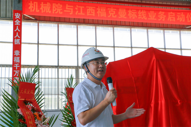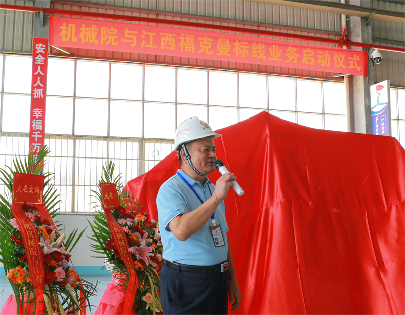 機械院黨委書記、董事長、總經(jīng)理王吉才和福克曼公司總經(jīng)理張磊等人在機械院第二車間為全自動熱熔標線機揭幕,機械院領(lǐng)導(dǎo)班子成員、機電工程公司全體員工參加儀式。