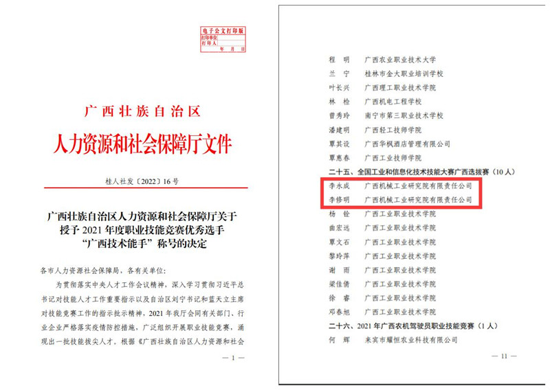 近日,廣西壯族自治區(qū)人力資源和社會保障廳印發(fā)了《關(guān)于授予2021年度職業(yè)技能競賽優(yōu)秀選手“廣西技術(shù)能手”稱號的決定》,向在2021年度自治區(qū)級職業(yè)技能競賽中取得優(yōu)異成績的選手授予“廣西技術(shù)能手”稱號。機械院李永成、李修明2名同志憑借在2021年度自治區(qū)級職業(yè)技能競賽中的突出表現(xiàn),在此次表彰中獲此殊榮。