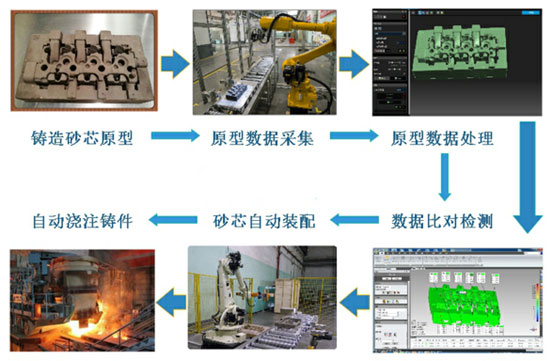 產(chǎn)品質(zhì)量檢測是企業(yè)生產(chǎn)現(xiàn)場在線工作模式,是一個生產(chǎn)線的工位,對測量設(shè)備精度和功能的要求遠超過反求設(shè)計。因此,該檢測系統(tǒng)可無縫應(yīng)用于產(chǎn)品質(zhì)量在線檢測,如鑄造、鍛壓及注塑等生產(chǎn)線上的鑄件、鍛件、沖壓件、注塑件等復(fù)雜曲面產(chǎn)品檢測,“一鍵式”全自動完成掃描檢測流程,保證最佳的測量精度和速度,實現(xiàn)質(zhì)量控制(QC)與部件生產(chǎn)環(huán)節(jié)緊密結(jié)合。主要技術(shù)包括: